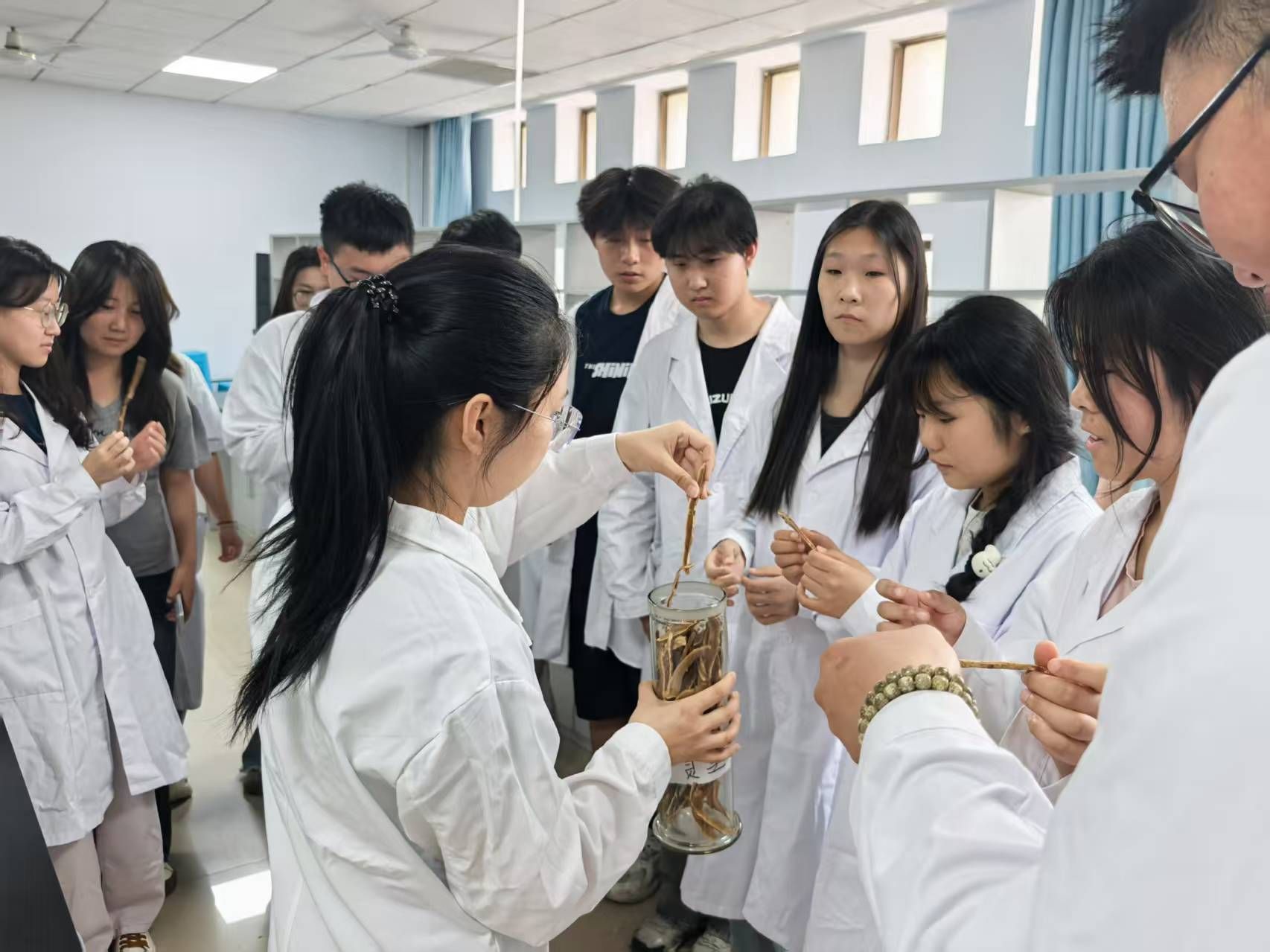 专业引领,中药科普润心田。活动邀请了药学教研室闫老师在药学实训室开展“沉浸式”中药科普讲座,从中医“情志调摄”理论出发,讲解中药材的药用价值及其在安神解郁、舒缓情绪方面的独特功效。闫老师以丁香、艾叶、陈皮、灵芝等十余种常见药材为例,深入浅出地介绍了其药理作用和文化内涵,让同学们在专业学习中领悟“医者仁心”的真谛,同时学会运用传统智慧调节自身情绪。“原来中药不仅能治病,还能养心!”一位参与活动的同学感慨道。