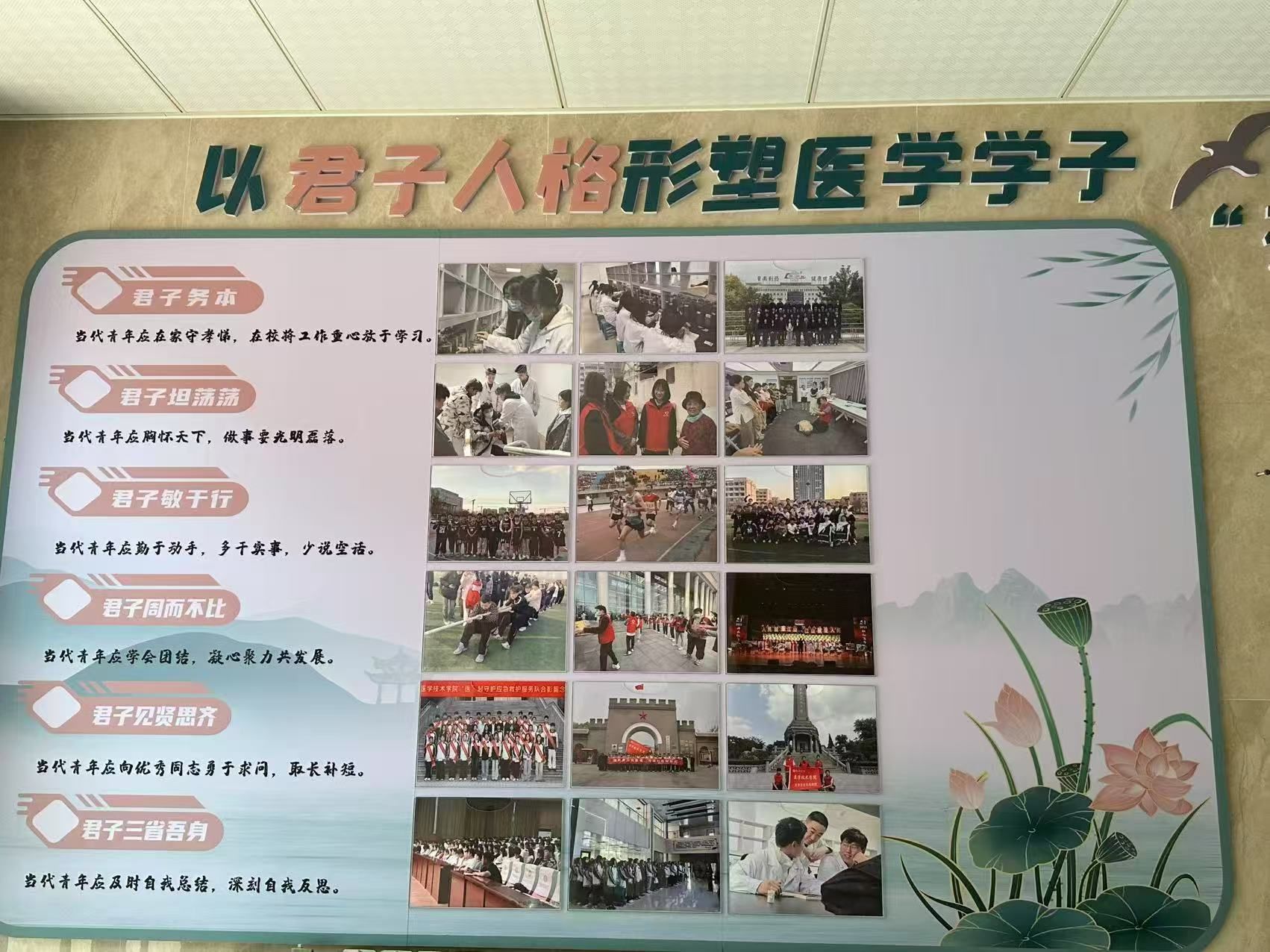 一、环境浸润,营造君子文化氛围。打造“君子文化墙”长廊:在教学楼、宿舍楼等学生日常活动区域,精心设计布置“君子文化墙”。墙面内容融合医学元素,展示古今中外兼具仁心仁术的“大医”典范、经典医德箴言,如《大医精诚》节选、君子品格内涵解读,以及学生践行君子之风的优秀事迹,使文化理念可视可感,时刻浸润学子心灵。
