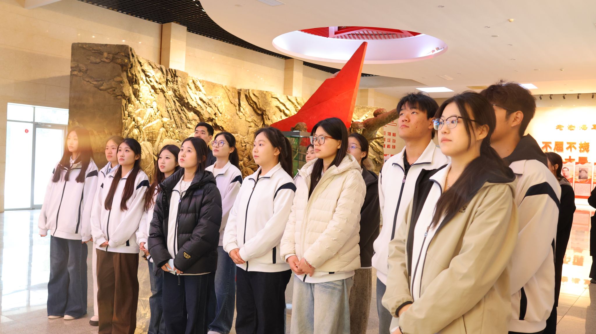 下午3时许,全体师生在讲解员引导下,依次参观渤海革命老区纪念馆、烈士英名录碑廊及革命遗址复原展区。一幅幅历史图片、一件件革命文物、一段段文献史料,将战争年代渤海区军民“不屈不挠、艰苦奋斗、顾全大局、无私奉献”的峥嵘岁月拉到了眼前。“一马三司令”“刘胡兰式的女英雄吴洪英”……英烈们的故事,让不少学生红了眼眶。一位学生入党积极分子在现场表示:“走进渤海老区,才真正读懂了‘江山就是人民,人民就是江山’这句话的分量。作为医学生,我们要把红色精神转化为踏实学习的劲头,将来真正为老百姓做点实事。”